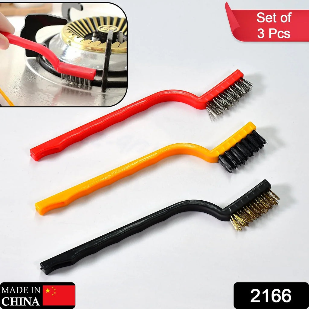 2166 3pc Mini Wire Brush Set Brass Nylon Stainless Steel Bristles Household Cleaning Brush for Gas Stove, Smoke Machine Tool Burner Tiles Tap Rust Removal Welding Slag Dirt & Paint Scrubbing.